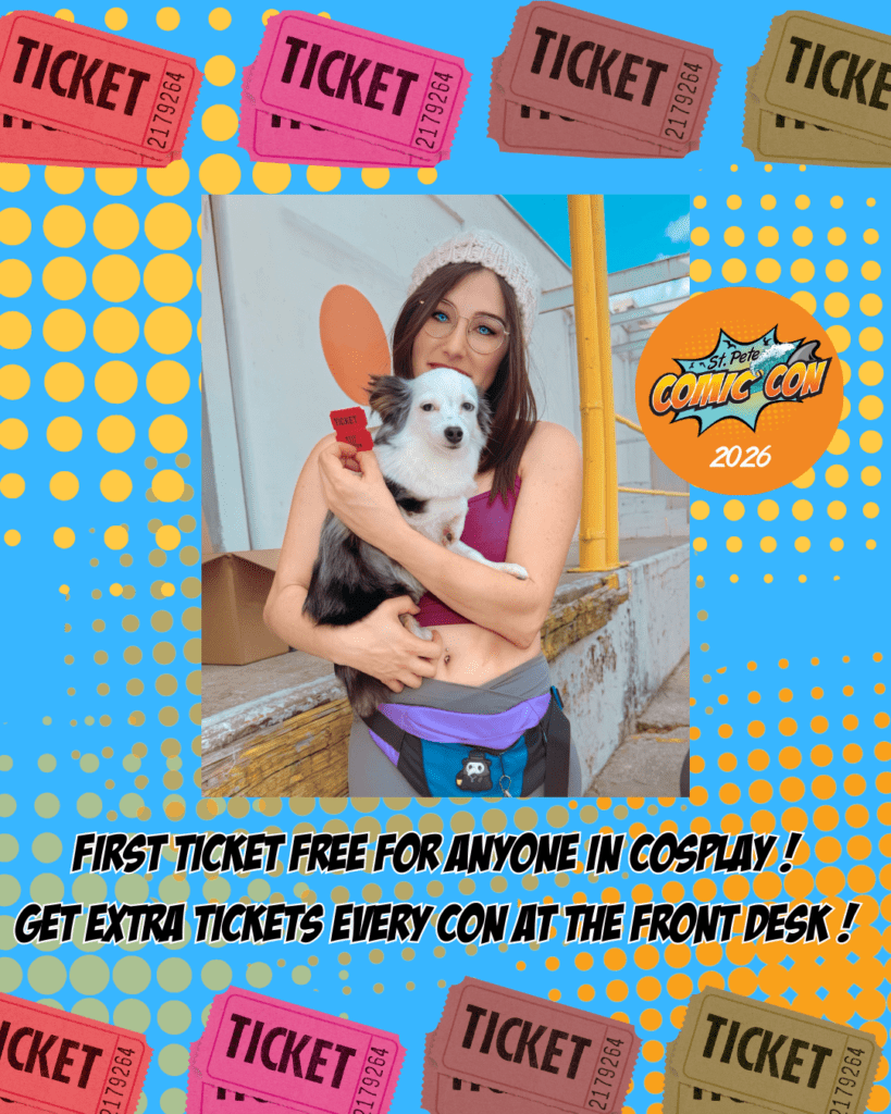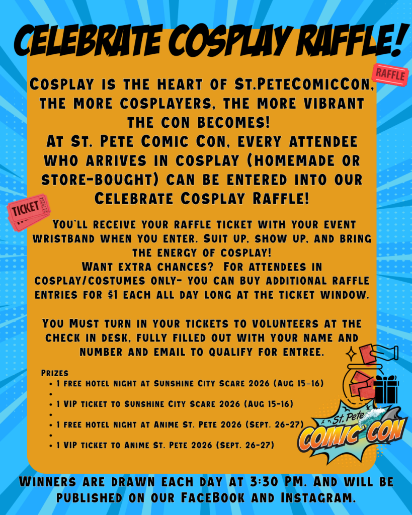 Cosplay is the heart of St. Pete Comic Con, the more cosplayers, the more vibrant the con becomes! At St. Pete Comic Con 2026, every attendee who arrives in cosplay (homemade or store-bought) can enter into our Celebrate Cosplay Raffle. You’ll receive your raffle ticket with your event wristband when you enter. Suit up, show up, and bring the energy of cosplay!